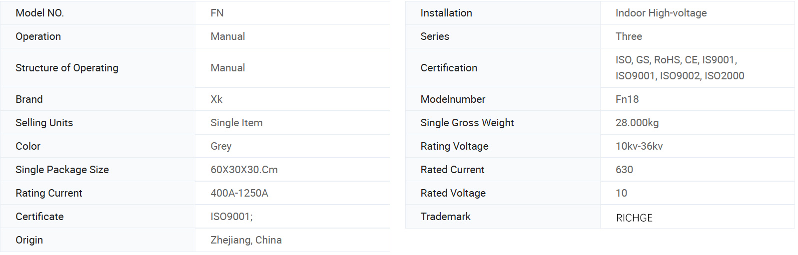 يتضمن مفتاح FN18 القياسي إطارًا فولاذيًا للخدمة الشاقة مع عوازل متوقفة ، ونظام إطفاء قوس فريد من نوع Puffer ، وآلية تشغيل ومكونات الحمل الحالية ، بما في ذلك المقاطعات من نوع الشفرة مع المفصلات المصبوبة وموصلات الفك.