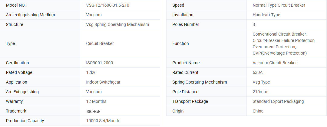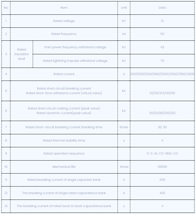 المعلمات الفنية من VSG-12 1600A VCB النوع الثابت القطب الصلب
